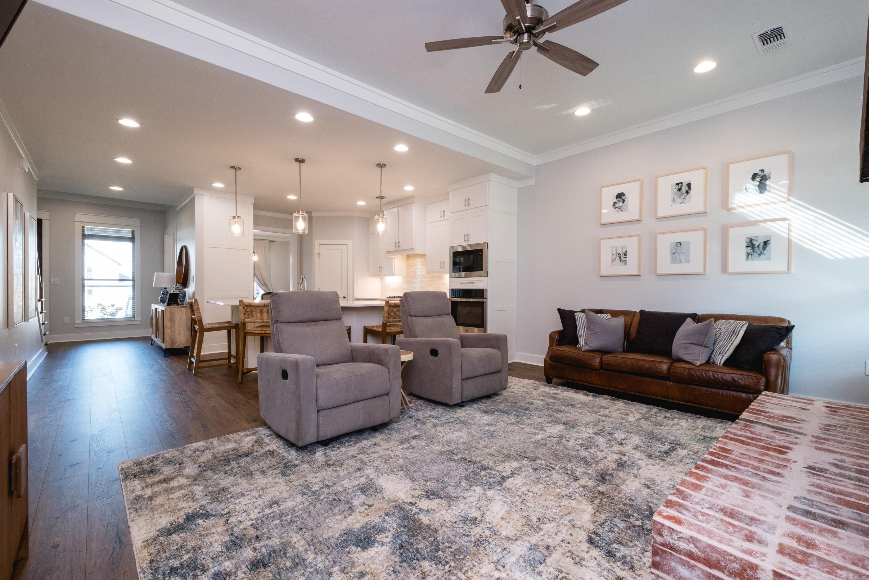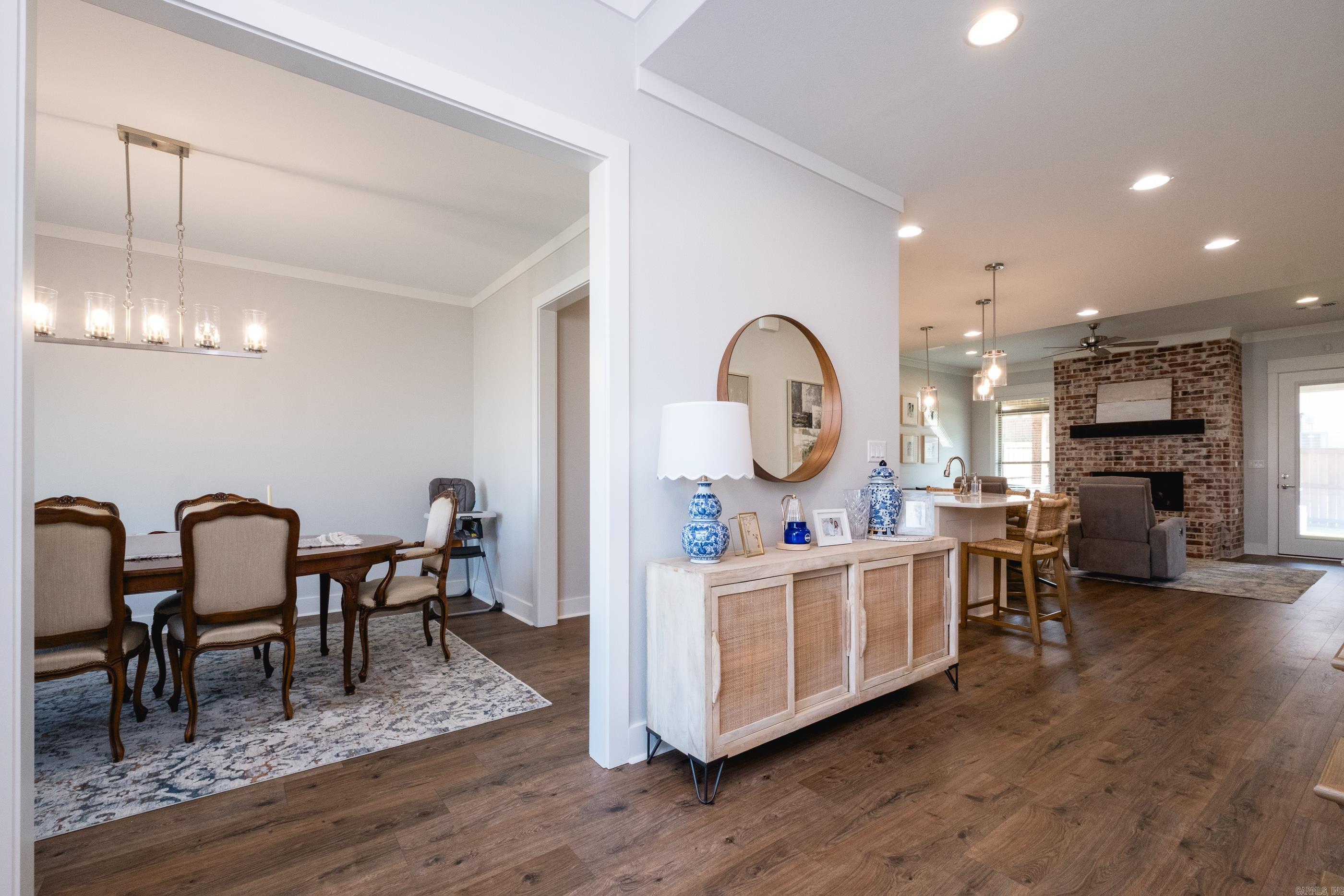 Built in 2023, this beautiful home combines modern design with everyday functionality on a spacious corner lot. The two-car side-load garage enhances curb appeal, while the open-concept interior offers seamless living and entertaining. A dedicated dining room opens to a bright kitchen featuring a large center island with bar seating, marble countertops, pendant lighting, a walk-in pantry, stainless steel appliances, and a gas cooktop. The kitchen flows effortlessly into the inviting living area highlighted by a brick fireplace with gas logs. The main-level primary suite includes dual walk-in closets, dual vanities, a soaking tub, a walk-in shower, and convenient access to the laundry room. Upstairs, you’ll find two additional bedrooms and a generously sized bonus room, ideal for a playroom, home office, or media space. Enjoy outdoor living on the covered patio overlooking the fully fenced, level backyard with direct access to the garage. Offering comfort, style, and practicality, this home is move-in ready and designed for easy living.