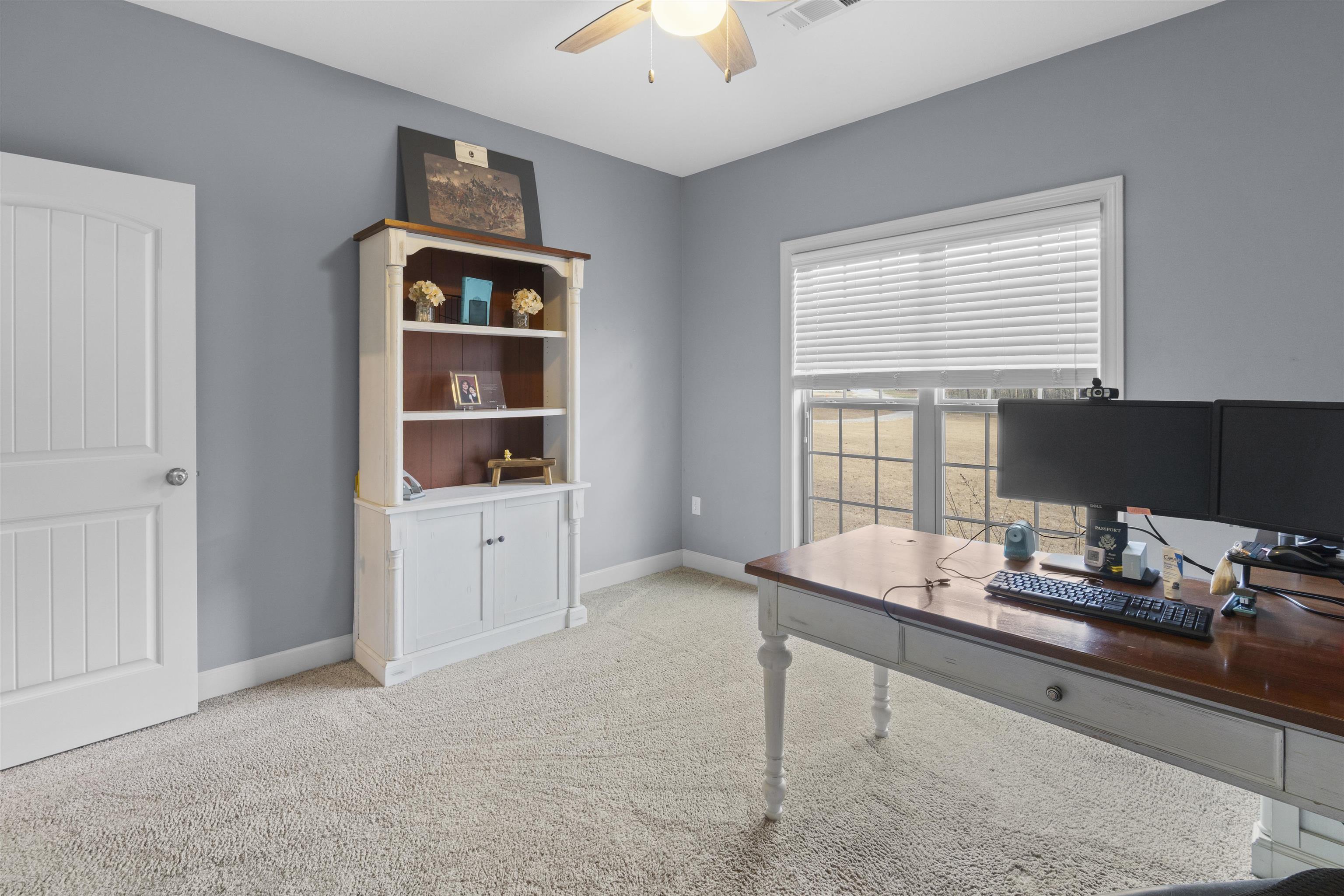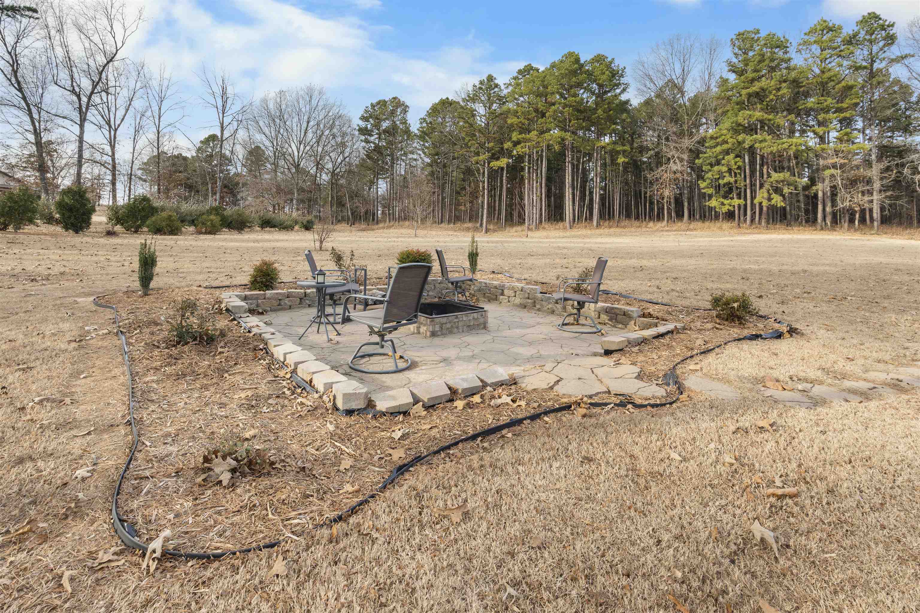 Tucked away at the end of a private road, this custom built 3 bedroom, 2 bath brick home sits on 5.6 acres, offering privacy and comfort in a beautiful setting. The open floor plan features a spacious living area with a cozy gas log fireplace, a breakfast area, and a separate formal dining space. The kitchen is thoughtfully designed with custom cabinetry, granite countertops, a built-in oven, gas cooktop, and a large walk-in pantry. The master suite is complete with an attached full bathroom featuring a soaking tub, walk-in tile shower, dual vanities, and a walk-in closet. Step outside to enjoy the back patio, a pergola-covered patio area, and a dedicated firepit space ideal for relaxing or hosting gatherings. Additional features include a storage building that conveys with the property, an attached two-vehicle garage, and an underground dog fence.